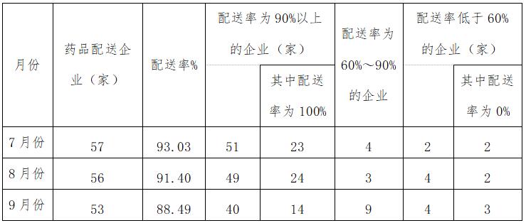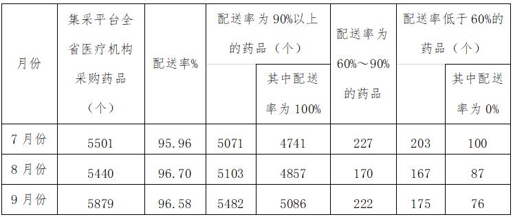 为进一步压实集采(挂网)药品生产企业供应保障的主体责任,确保医疗机构临床使用需求,督促配送企业及时响应医疗机构采购订单,提高配送时效,及时处理医疗机构反映的供应配送问题,对无法及时满足医疗机构采购需求、不按协议供应的医药企业,依据相关管理规定给予相应信用评价,现就关于全省第三季度药品配送情况进行通报如下。