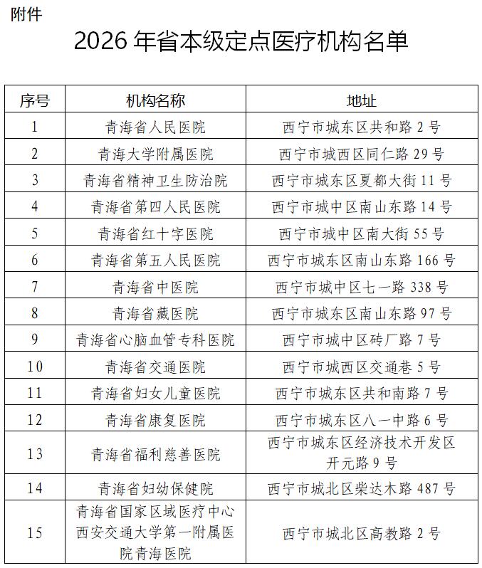 为方便全省参保人员就医,提高医疗保障基金使用效率,更好地保障广大参保人员权益,按照《医疗机构医疗保障定点管理暂行办法》(国家医疗保障局令第2号)和《青海省医疗保障定点医疗机构服务协议(2025修订版)》有关规定,对签订医保协议的省本级定点医疗机构名单进行公布,供参保人员选择,并接受社会监督。